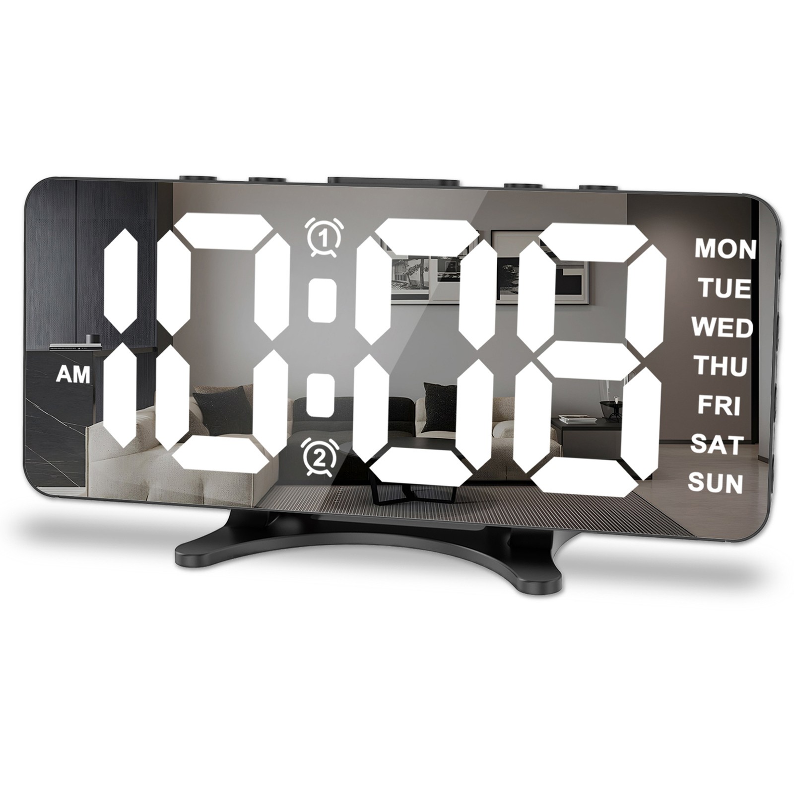KOSUMOSU Alarm Clock for Bedroom, 6.7" Led Desk Digital Clock,Mirror Clock,Dual Alarm Clock for Living Room with Seconds,Date,Week,12/24h,Dimming,Temp