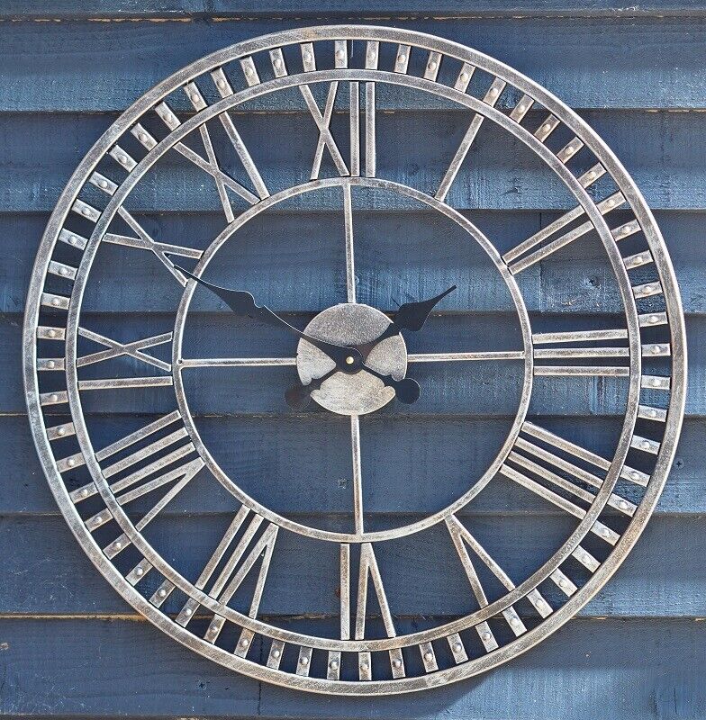 Large Buxton Garden Clock Outdoor Outside Indoor Wall Skeleton Grey Metal Clock
