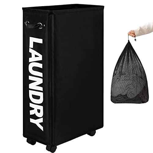 DOKEHOM 29-Inches Enlarged Slim Laundry Basket with Removable Wash Bag on Wheels, Collapsible Rolling Laundry Hamper, Foldable Narrow Corner Clothes Storage Bins (Black)