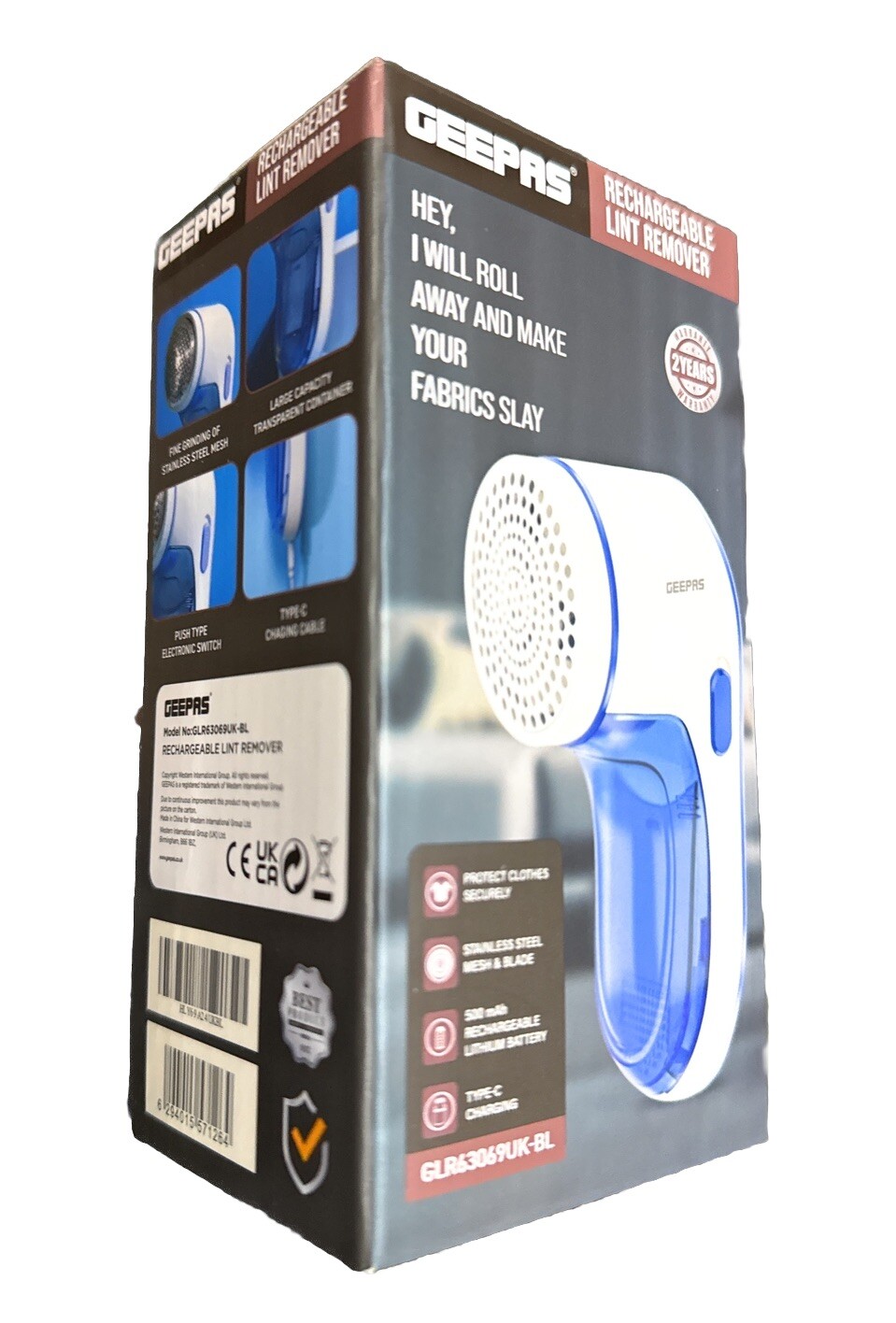 GEEPAS Lint Remover | Rechargeable Fabric Shaver for Clothes Wool Cotton Upholstery Pills | Portable Bobble Remover Battery Operated 40Min Runtime Auto Shut-Off Detachable Collector 2 Yr Warranty Blue