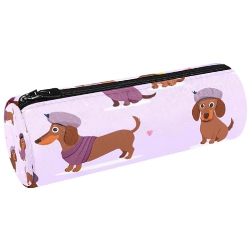 VAPOKF Dachshund with Berets Clothes Leather Barrel Pen Pencil Case Coin Purse Cosmetic Makeup Bag for Student Stationery School Office Storage