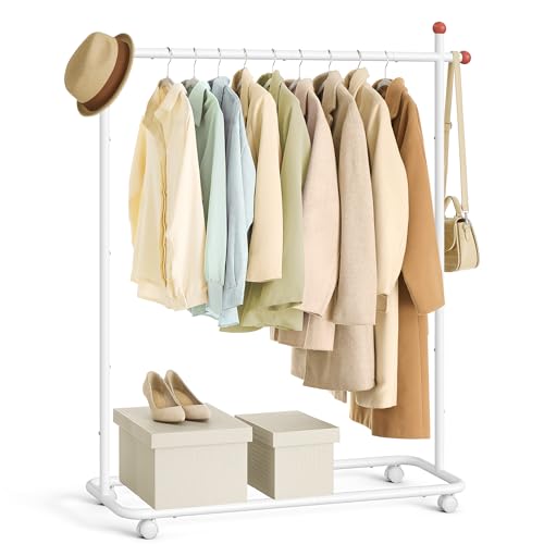 SONGMICS HOME Clothes Rail, Clothes Rack on Wheels, Portable Clothing Rack, with 1 Clothes Hanging Rail, Matchstick-Shaped Hooks, Matte White HSR170W01