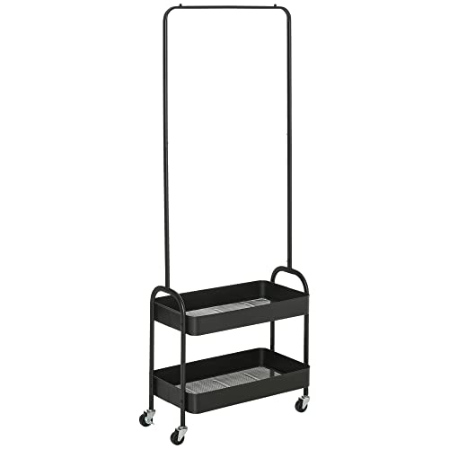 HOMCOM Metal Clothes Rack with Shoe Storage, Clothing Rail on Wheels, Freestanding Hall Tree, Coat Stand with 2 Storage Shelf, Black