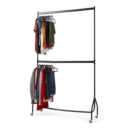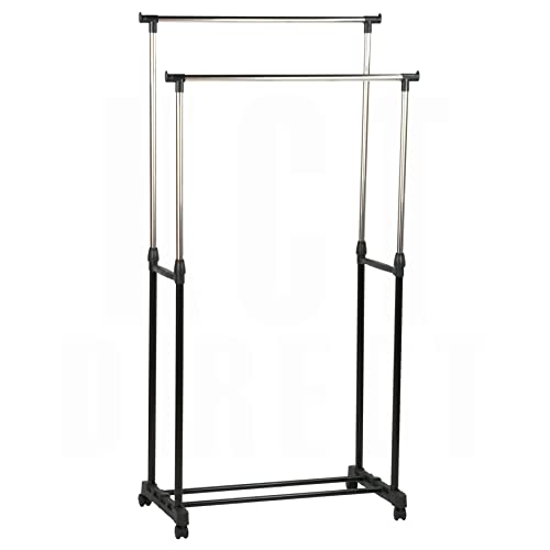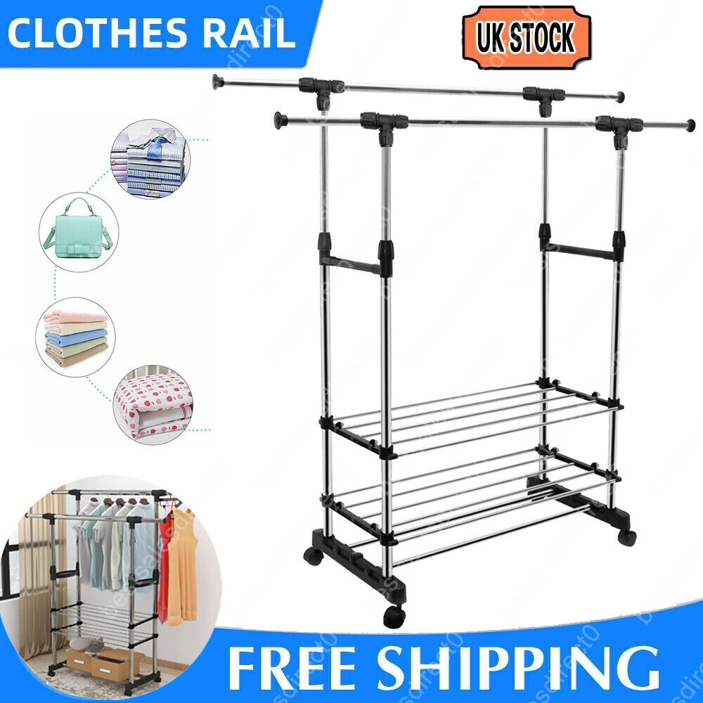 DOUBLE CLOTHES RAIL ON WHEELS PORTABLE ADJUSTABLE HANGING RACK GARMENT STORAGE