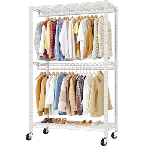Himimi Clothes Rail with Shelves, 3-Tier Adjustable Shelves & Double Hanging Rods, Heavy Duty Clothing Rail Clothes Rack on Wheels, Free Standing Open Wardrobe for Bedroom Coat, 60Wx42Dx205H cm, White