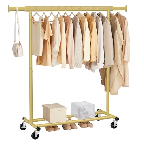 Clothes Rail, Portable Clothes Rack with Hook and Metal Storage Shelf, Heavy Duty Clothes Rail on Wheels, Clothing Rail Clothes Rails for Bedroom, Hanging Rails for Clothes, Holds up to 40 kg, Golden