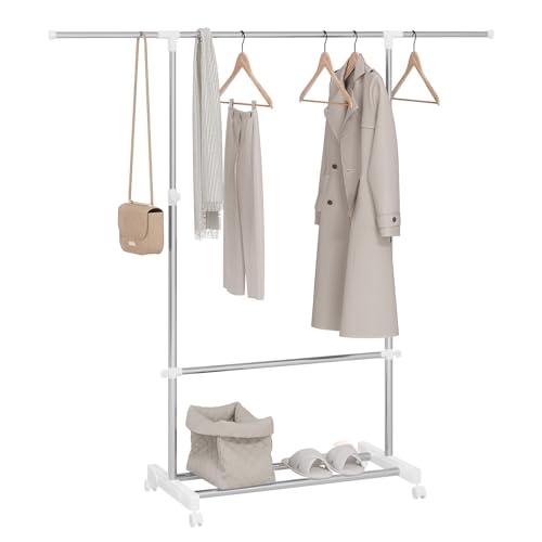 WOLTU Clothes Rack on Wheels, Height-Adjustable, Clothes Rail with Shelf, Metal Coat Rack (90-150) x (113-198) x 43 cm, Silver White