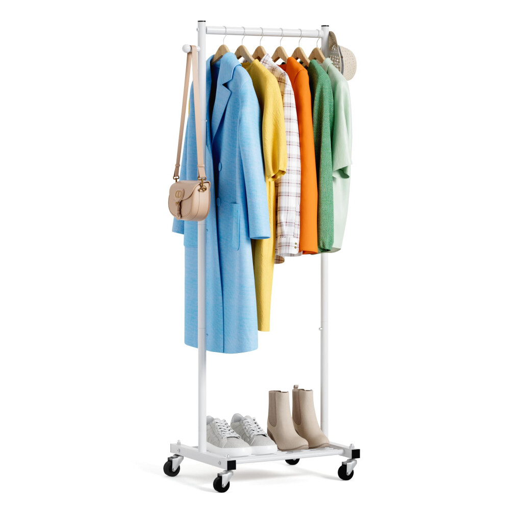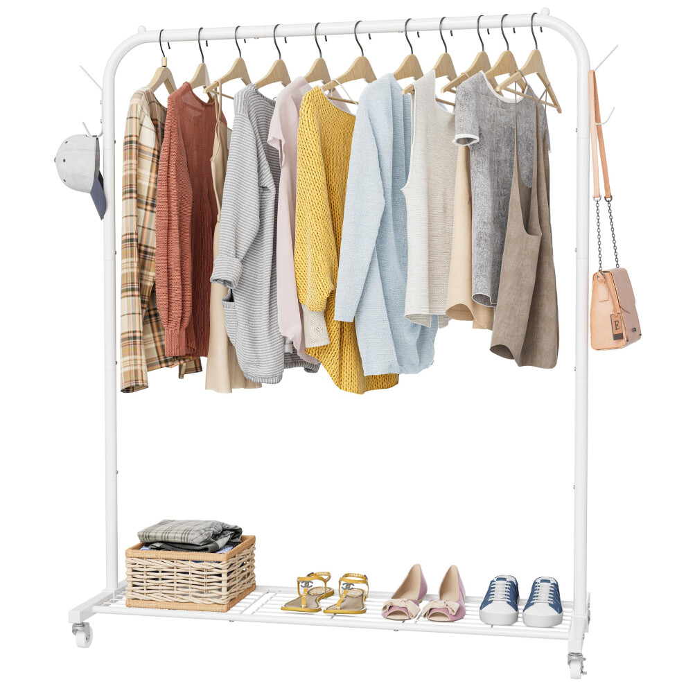 HOMIDEC Clothes Rail, Portable Clothes Rack with Hook and Metal Storage Shelf, Heavy Duty Clothes Rail on Wheels, Clothes Rails for Bedroom, Hanging Rails for Clothes, Holds up to 40 kg, White