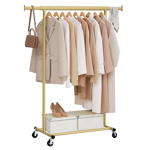 SONGMICS Clothes Rack, Clothes Rail on Wheels, Metal Clothing rail for Bedroom, 91 cm Long Hanging Rail, with Storage Shelf, 2 Lockable Wheels, Top Rail Holds up to 40 kg, Gold HSR025A01