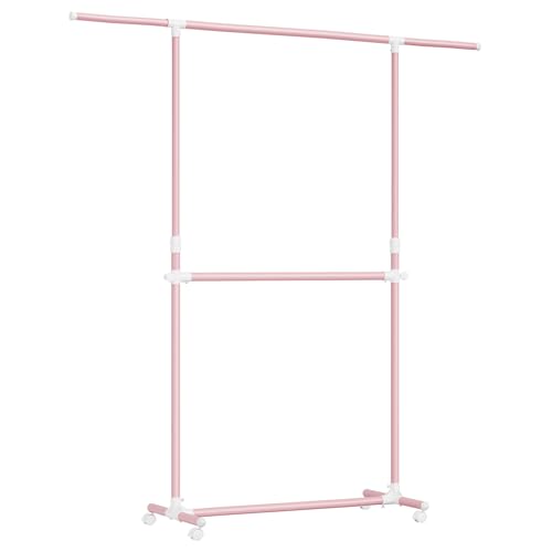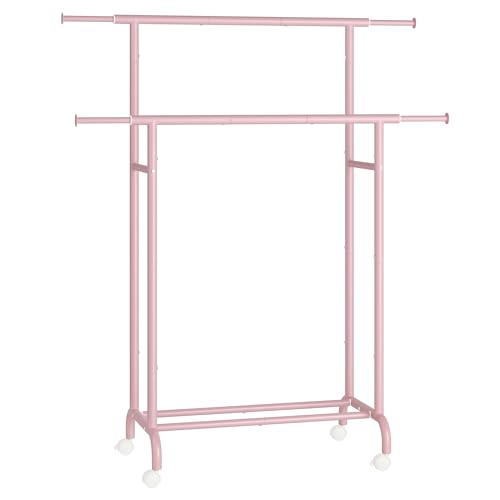 SONGMICS Clothes Rail, Double Clothes Rack on Wheels, Extendable Garment Rack, Heavy-Duty Metal Frame, 80 kg Total Max. Load, 83-120 cm Wide, Jelly Pink HSR133R01