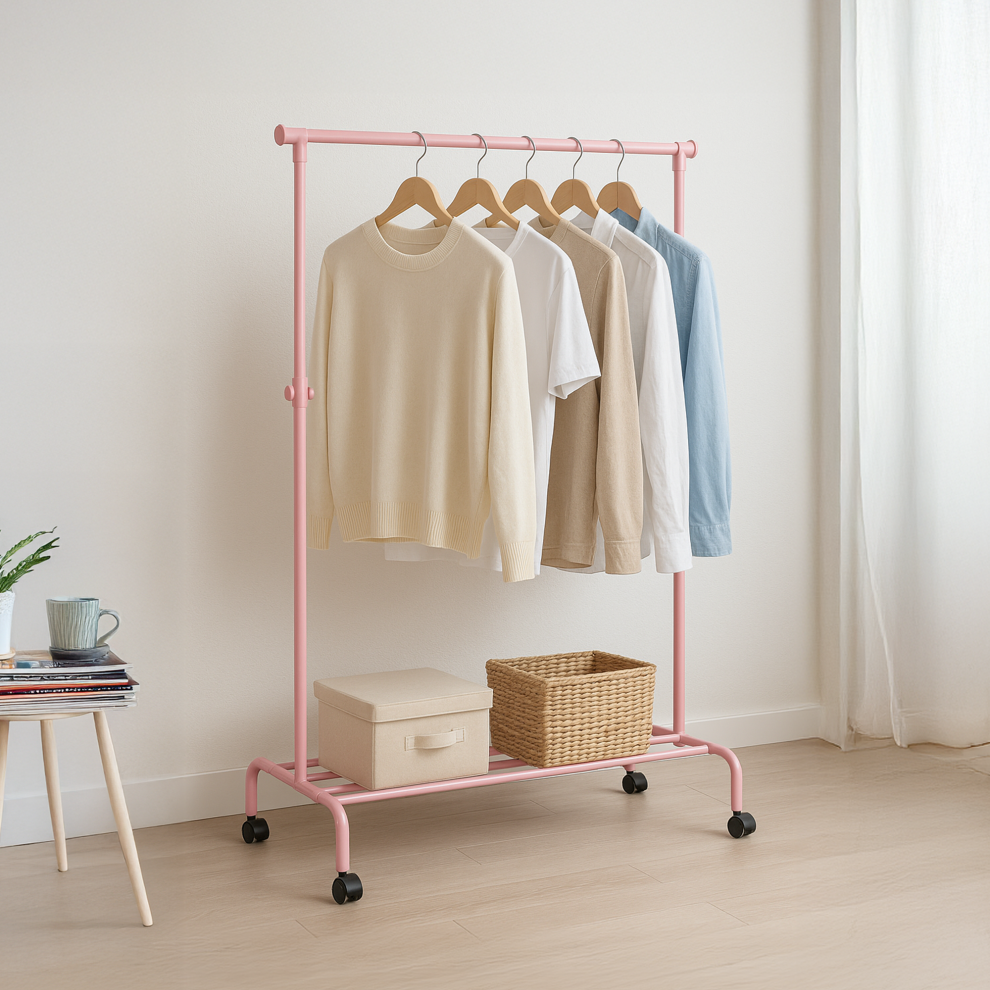 Moveable Clothes Rail On 4 Wheels With Telescopic Rod And Shoe Rack Adjustable Height Portable Storage Rack