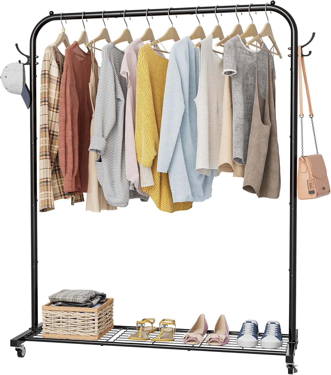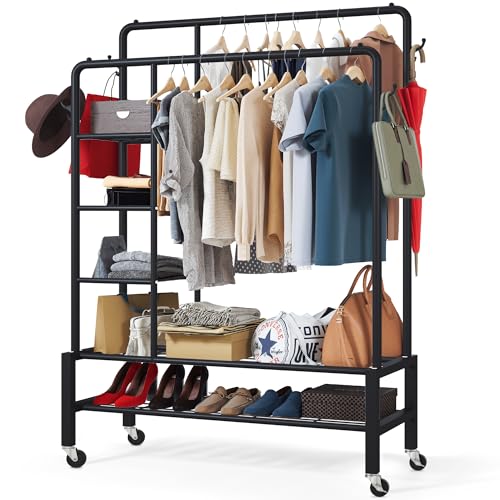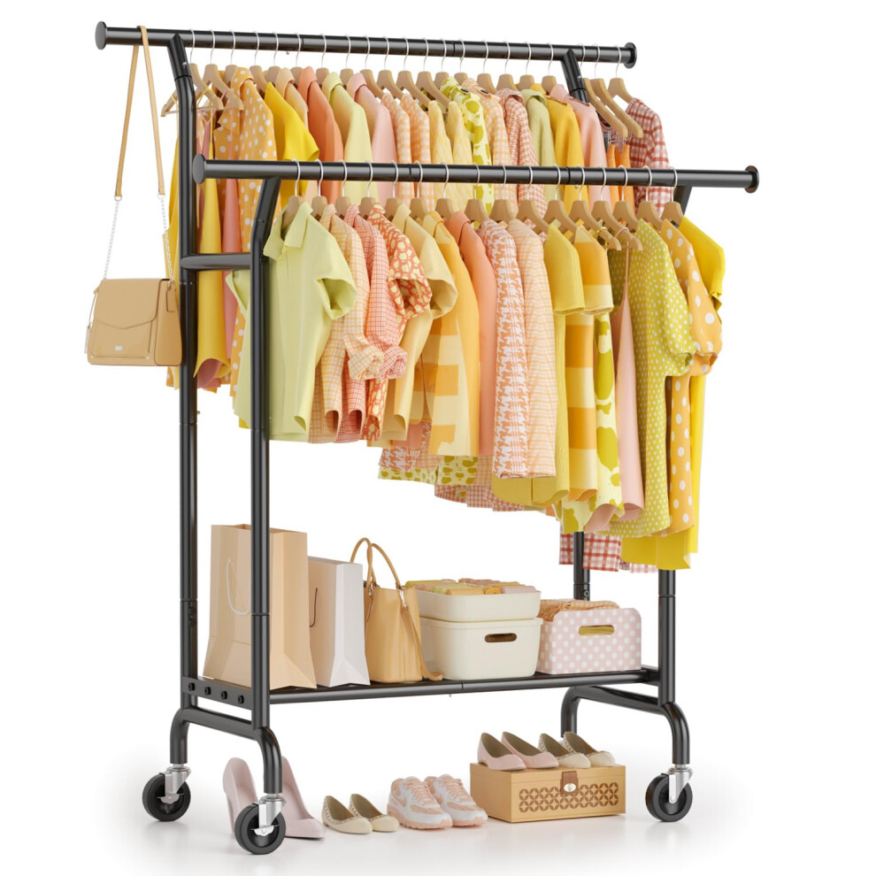 YOUDENOVA Clothes Rail on Wheels Clothes Rack Double Hanging Rails for Clothes Rails for Bedroom Heavy Duty Metal Stand Storage Shelf Black