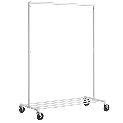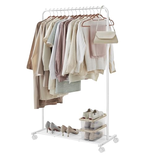 PIPOEI Mobile Clothes Rack on Wheels, Clothes Rail, 2-Tier Bottom Shelf Freestanding Black Clothes Shoe Storage, Clothes Shoe Shelf Organizer for Bedroom, Living Room White,150cm