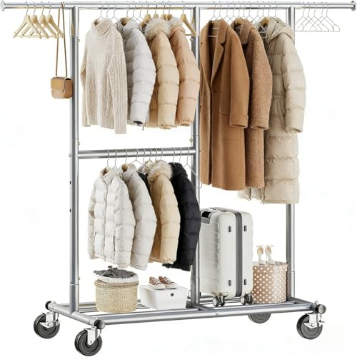 YOUDENOVA Clothes Rail on Wheels Clothes Rack Double Hanging Rails for Clothe...