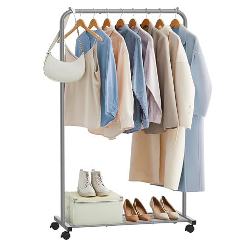 MISSLO Heavy Duty Clothes Rail on Wheels for Bedroom, Metal Clothes Rack Strong Clothing Garment Rack with Storage Bottom Shelf, Free standing Hanging