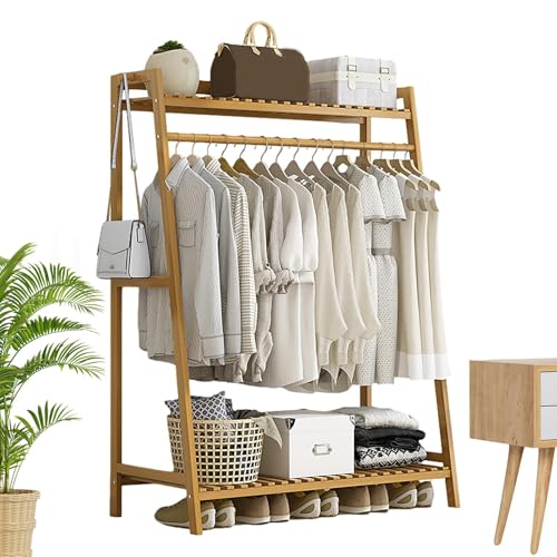 Bamboo Garment Rack with Shelves - Space-Saving Clothing Stand for Organizing Coats, Shoes & Hats in Home, Office, or Bedroom