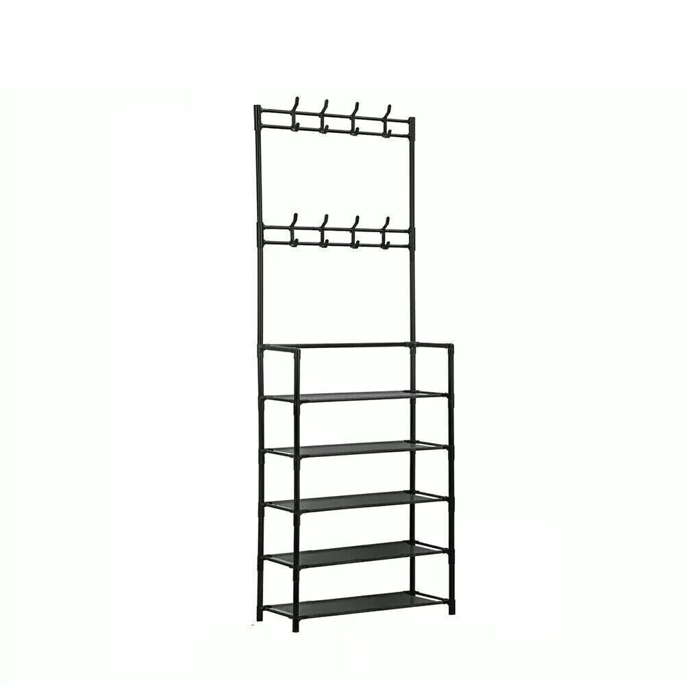 5 Tier 8 Hooks Hat & Coat Hanger Stand Shoe Rack Metal Shelf Storage Organiser