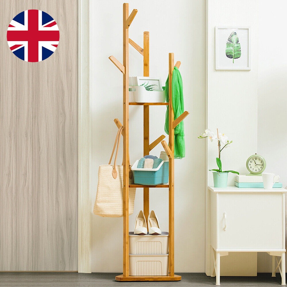 Bamboo Coat Hat Hanger Stand Rack with 2 Shelves Pants Hanger and 3 Hanger Hooks