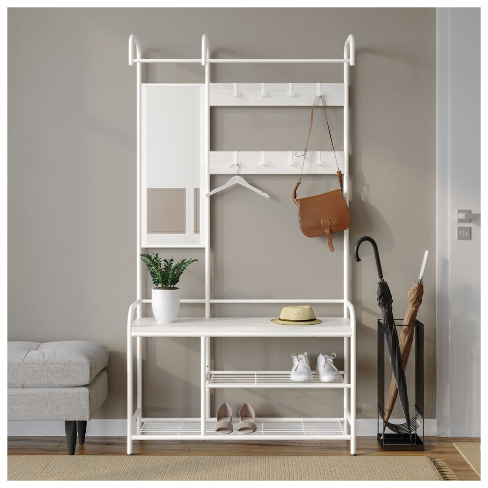 (White & White) Hallway Coat Hanger Stand & Shoe Bench Storage