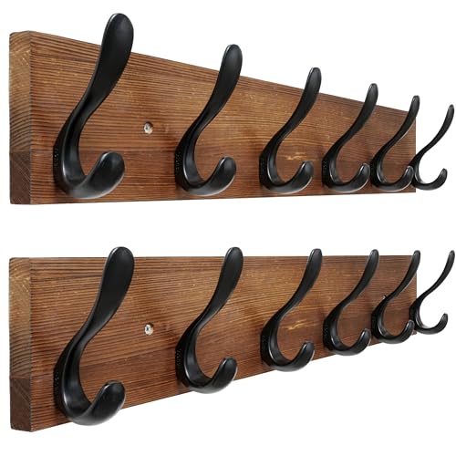 HONSKY Coat Rack Wall Mounted,61cm Long,Wooden Coat Rack with 6 Double Hooks,Large Wall Coat Rack,Coat Hanger Wall Mounted,Wooden Coat Rack,Brown/Black(2 Pack)