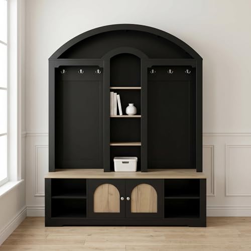 Aetherion 77" Arched Coat Rack With 6 Coat Hooks & Multiple Storage Spaces, 4-in-1 Solid Wood Entryway Hall Tree With Shoe Cabinet And 2 Doors For Hallway, Living Room, Mudroom Black