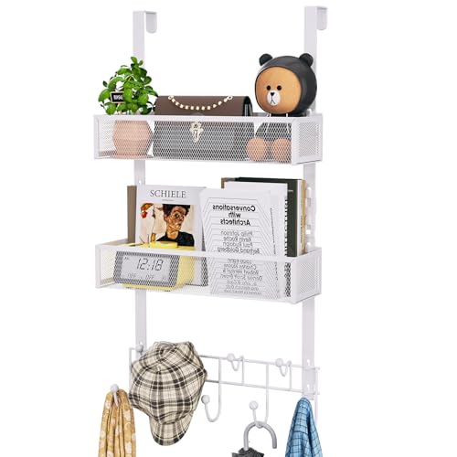 HapiRm Over The Door Organizer with 9 Coat Hooks and 2 Baskets, Stainless Steel Rustproof & Waterproof Over The Door Hanger Hooks for Bathroom, Kitchen, Bedroom-White (for 1.76in Doors)