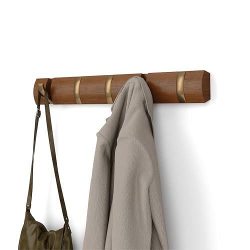 Umbra Flip 5-Hook Wall Mounted Coat Rack, Modern, Sleek, Space-Saving Coat Hanger with 5 Retractable Hooks to Hang Coats, Scarfs, Purses and More, Light Walnut/Warm Gold