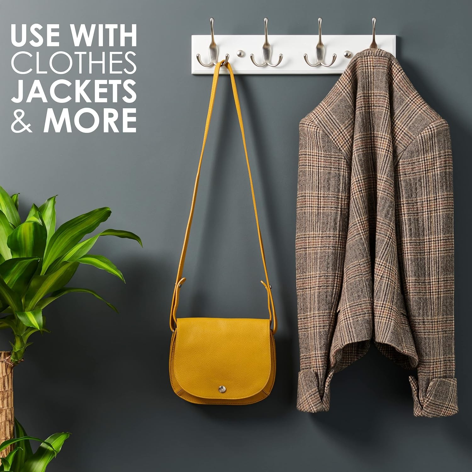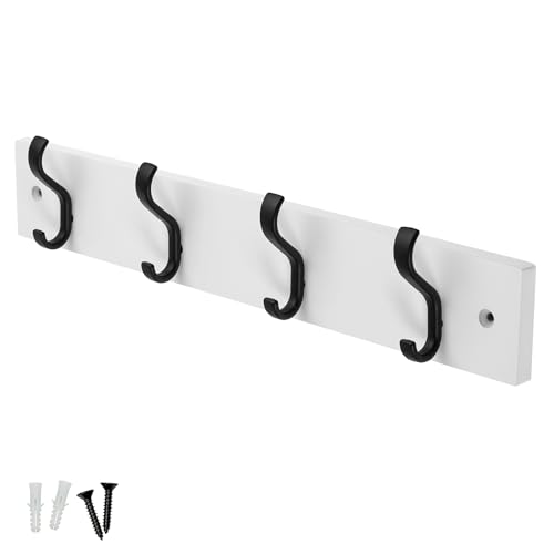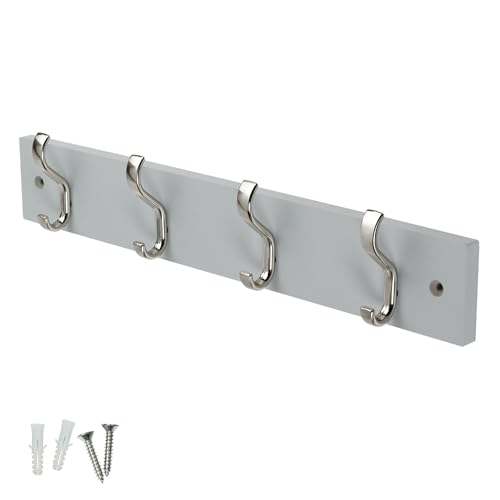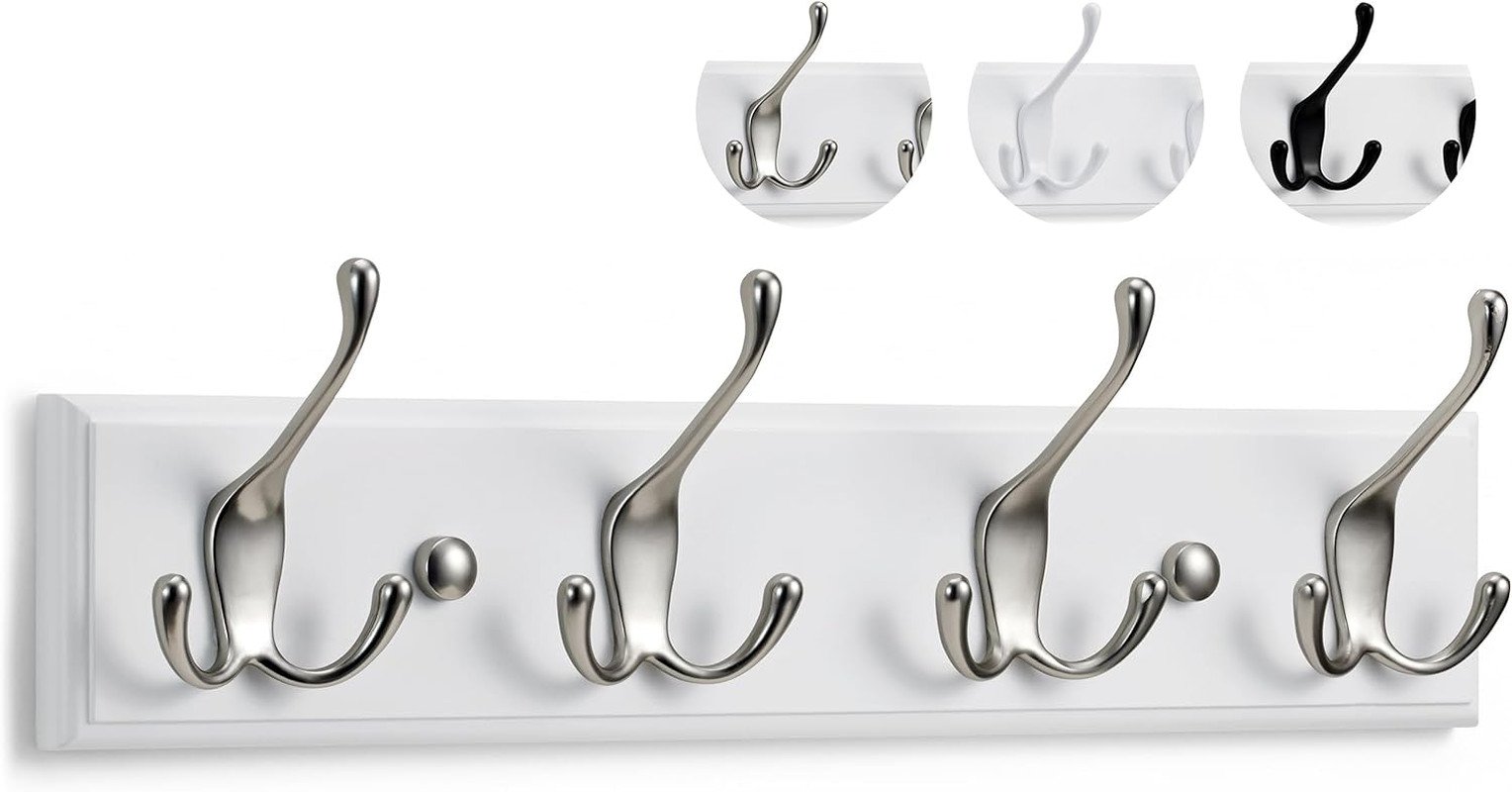 DOKEHOM 4-Satin Nickel Hooks on White Wooden Board Wall Mounted Coat Hook Rack Hanger
