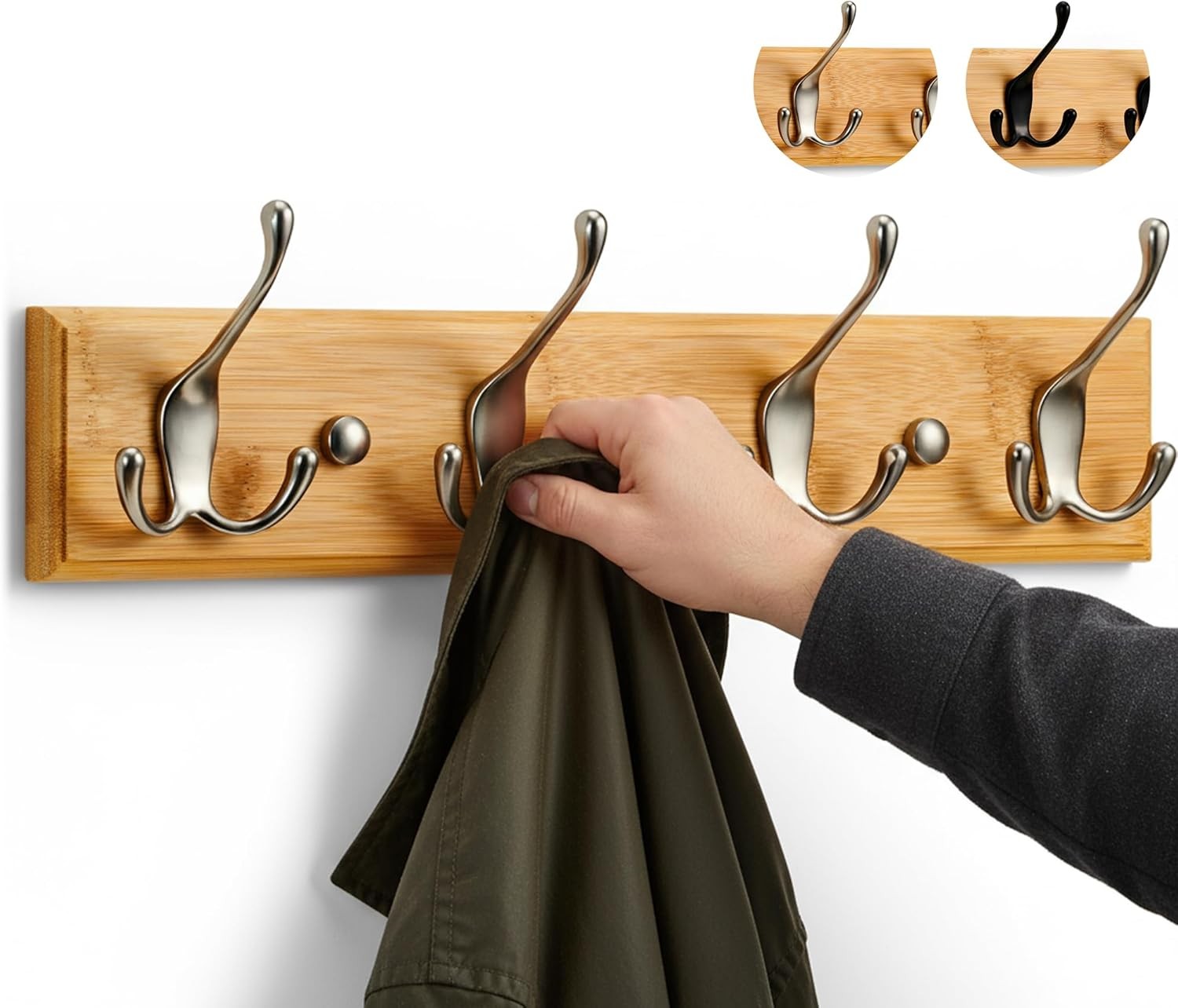 LARHN Wall-Mounted Coat Rack with 4 Triple Hooks on Bamboo Base, Matt-Nickel Fin