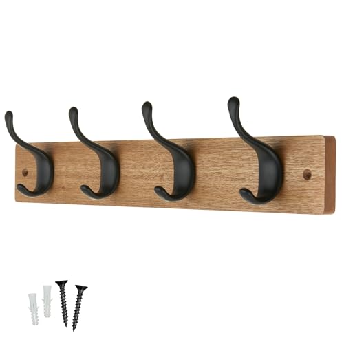 LARHN Wooden Coat Hooks - Wall Mounted Coat Rack - 4 Triple Black Coat Hooks for Wall on Bamboo - 42 cm - All Fixings Included for Quick & Easy Installation
