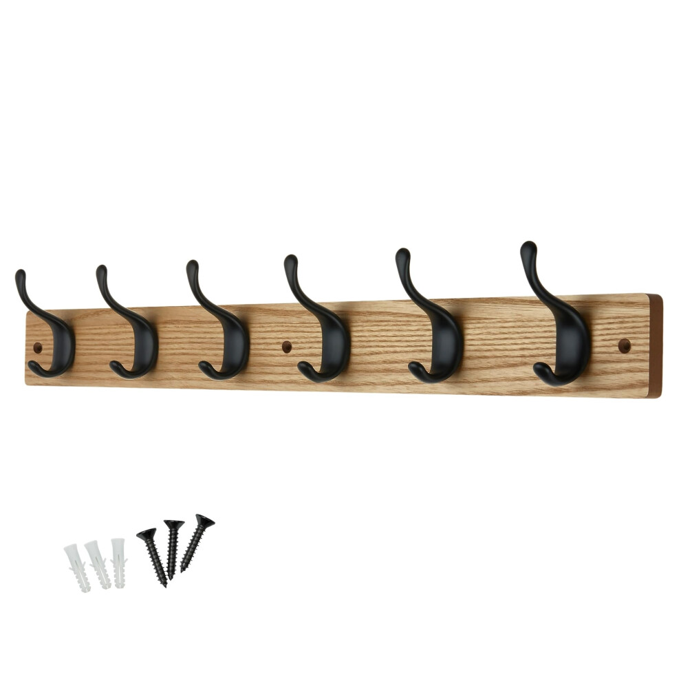 keypak 6 Matte Black Coat Hooks on Ash Effect Wooden Board - 68cm Modern Wall Mounted Coat Rack Clothes Hanger