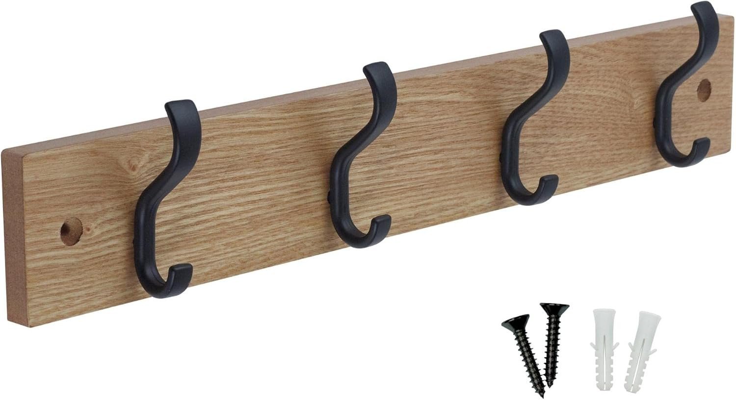 keypak 4 Matte Black Coat Hooks on Ash Effect Wooden Board - Modern Wall Mounted Coat Rack Clothes Hanger