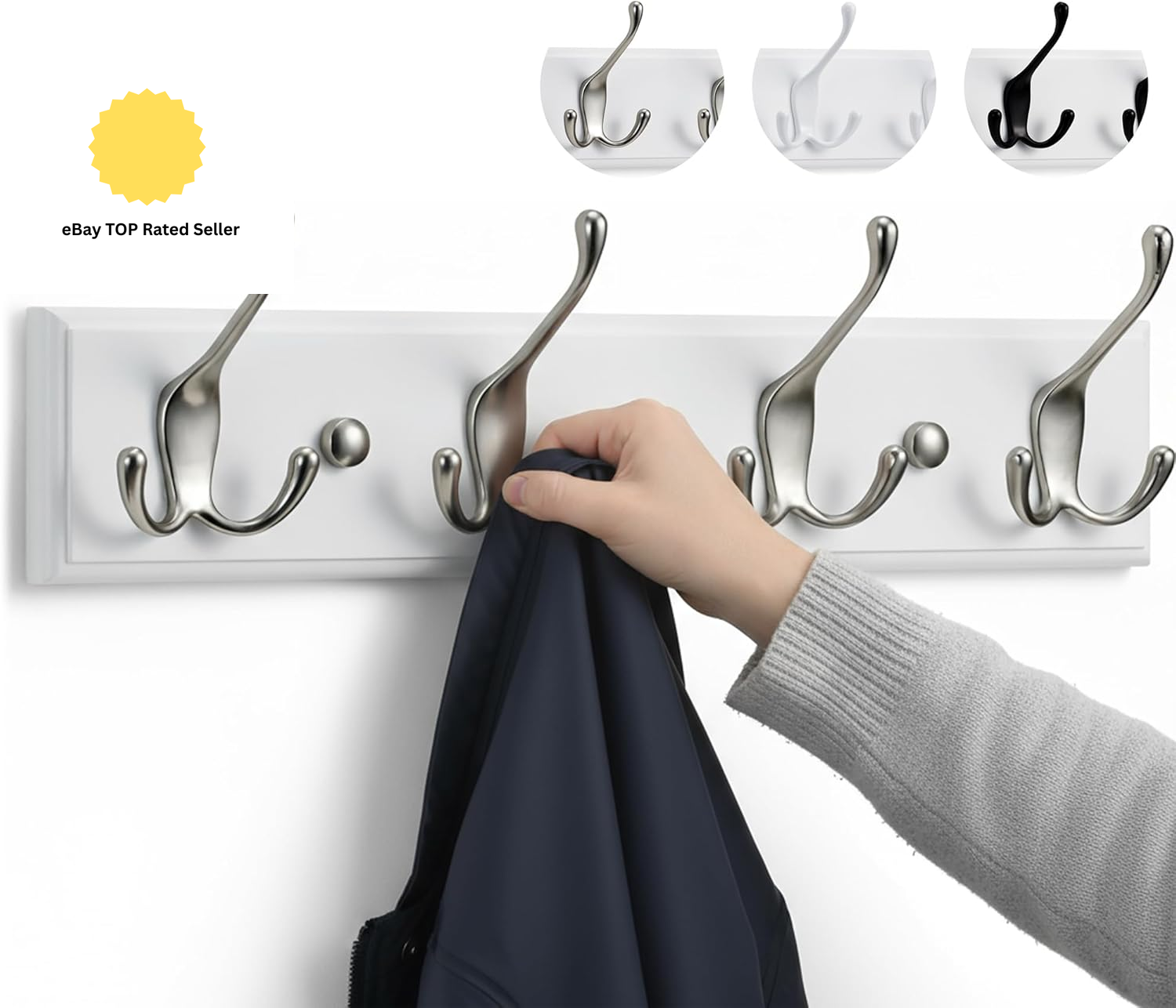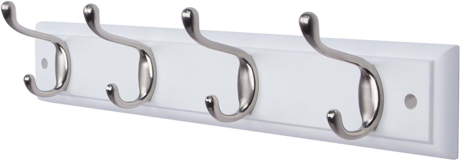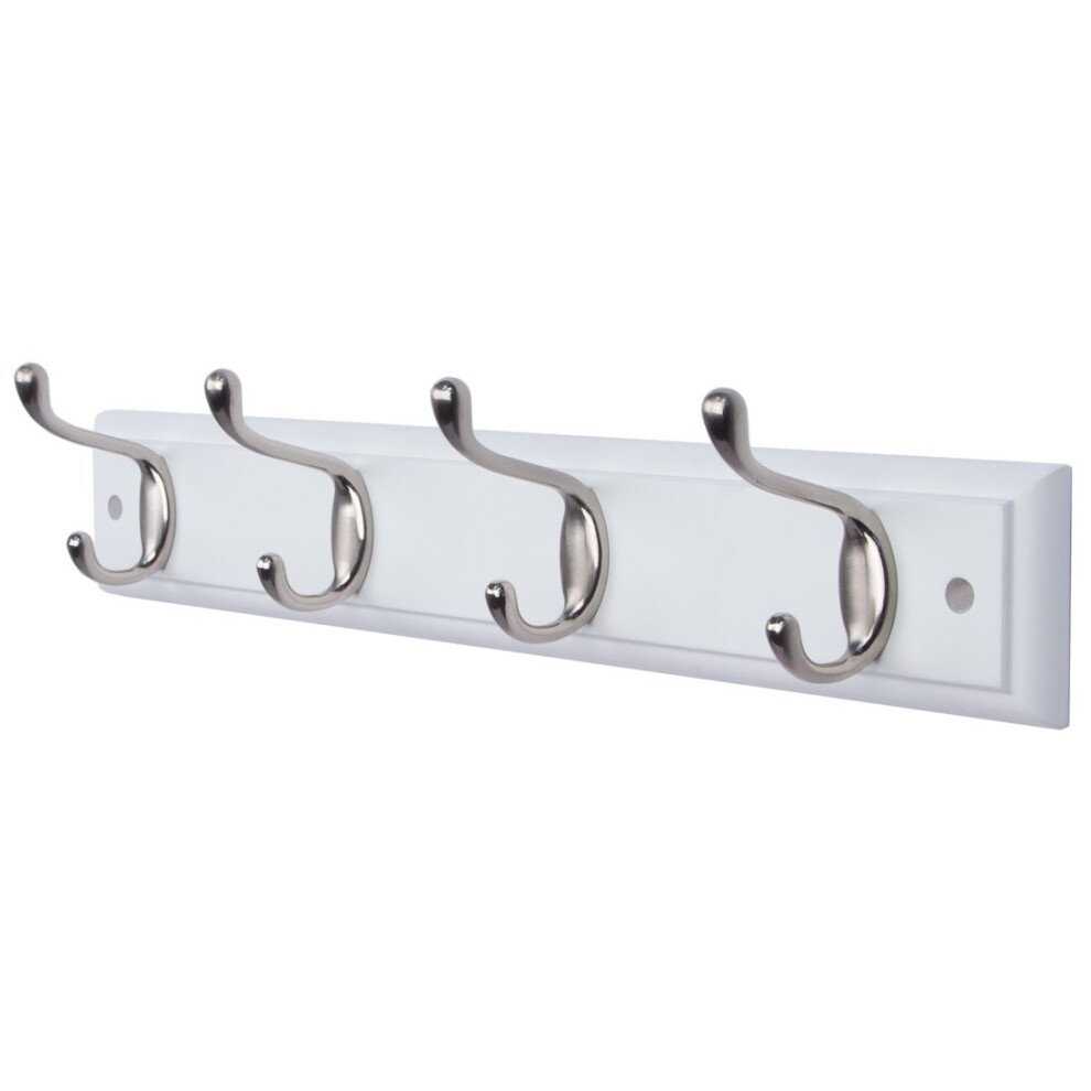 4-Satin Nickel Hooks on White Wooden Board Wall Mounted Coat Hook Rack Hanger