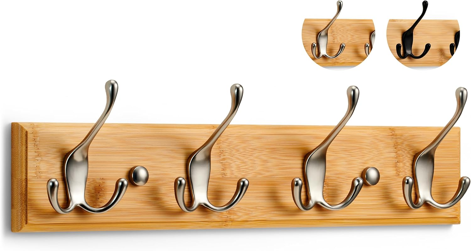 LARHN Wall-Mounted Coat Rack with 4 Triple Hooks, Matt-Nickel Finish on Bamboo B