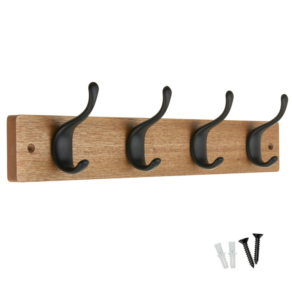 keypak 4 Matte Black Coat Hooks on Ash Effect Wooden Board - 46cm Modern Wall Mounted Coat Rack Clothes Hanger