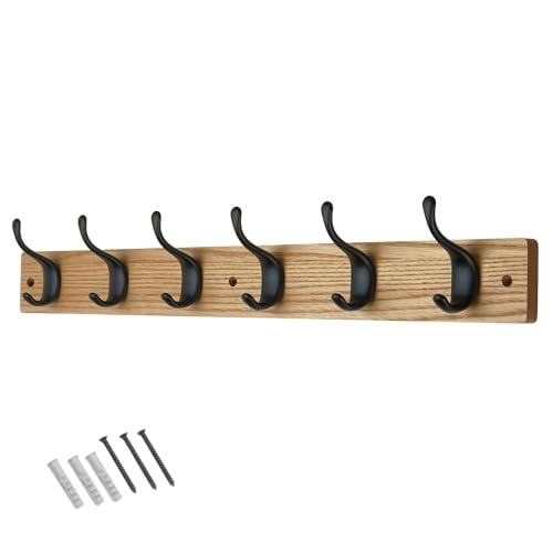 LARHN Wooden Coat Hooks - Wall Mounted Coat Rack - 6 Triple Black Coat Hooks for Wall on Bamboo - 59 cm - All Fixings Included for Quick & Easy Installation