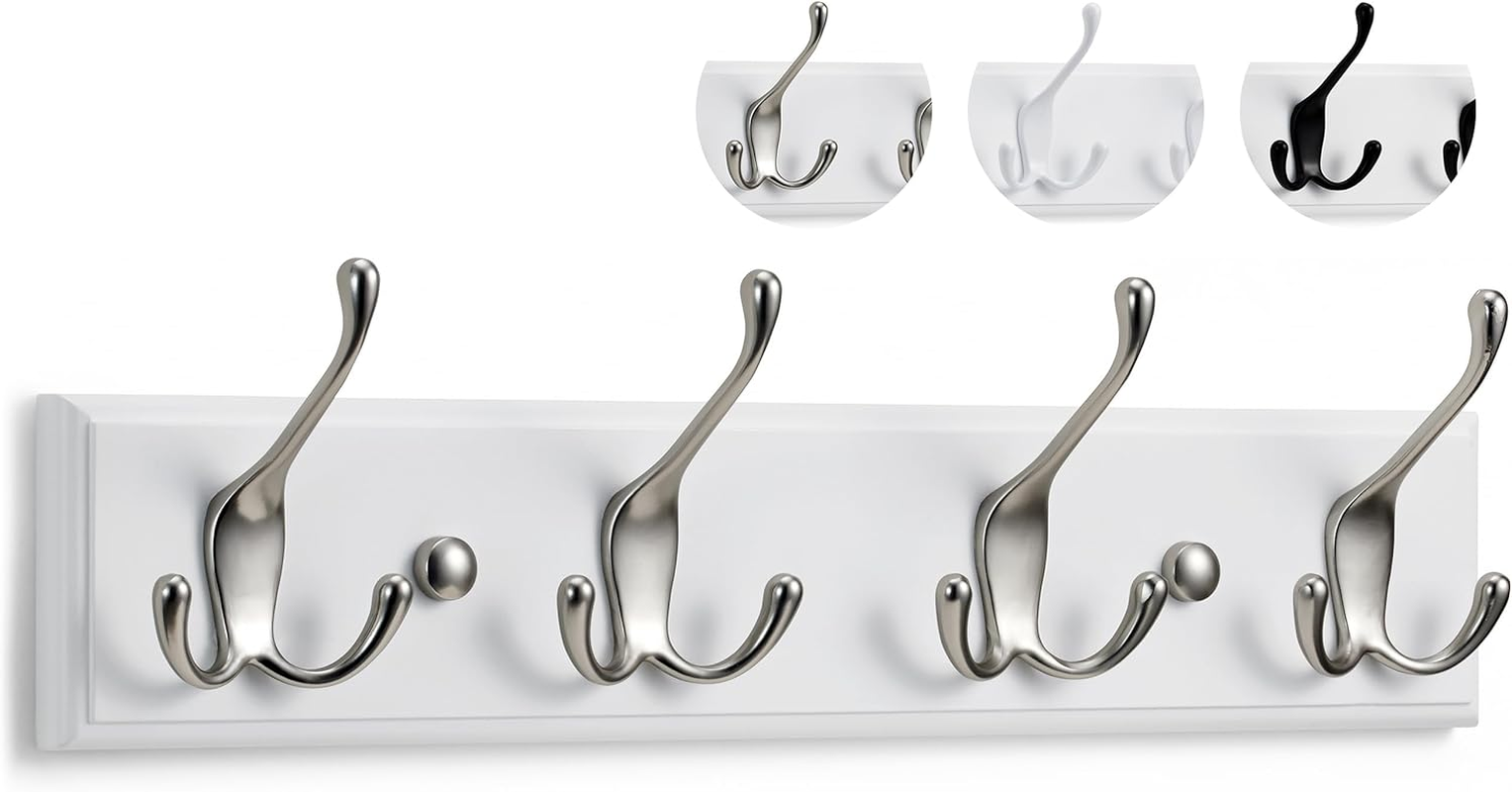Wall-Mounted Coat Rack - 4 Matt-Nickel Triple Coat Hooks for Wall on White Woode