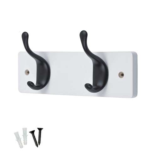 keypak 2 Matte Black Coat Hooks on White Wooden 22.5cm Board - Modern Wall Door Mounted Coat Rack Clothes Hanger