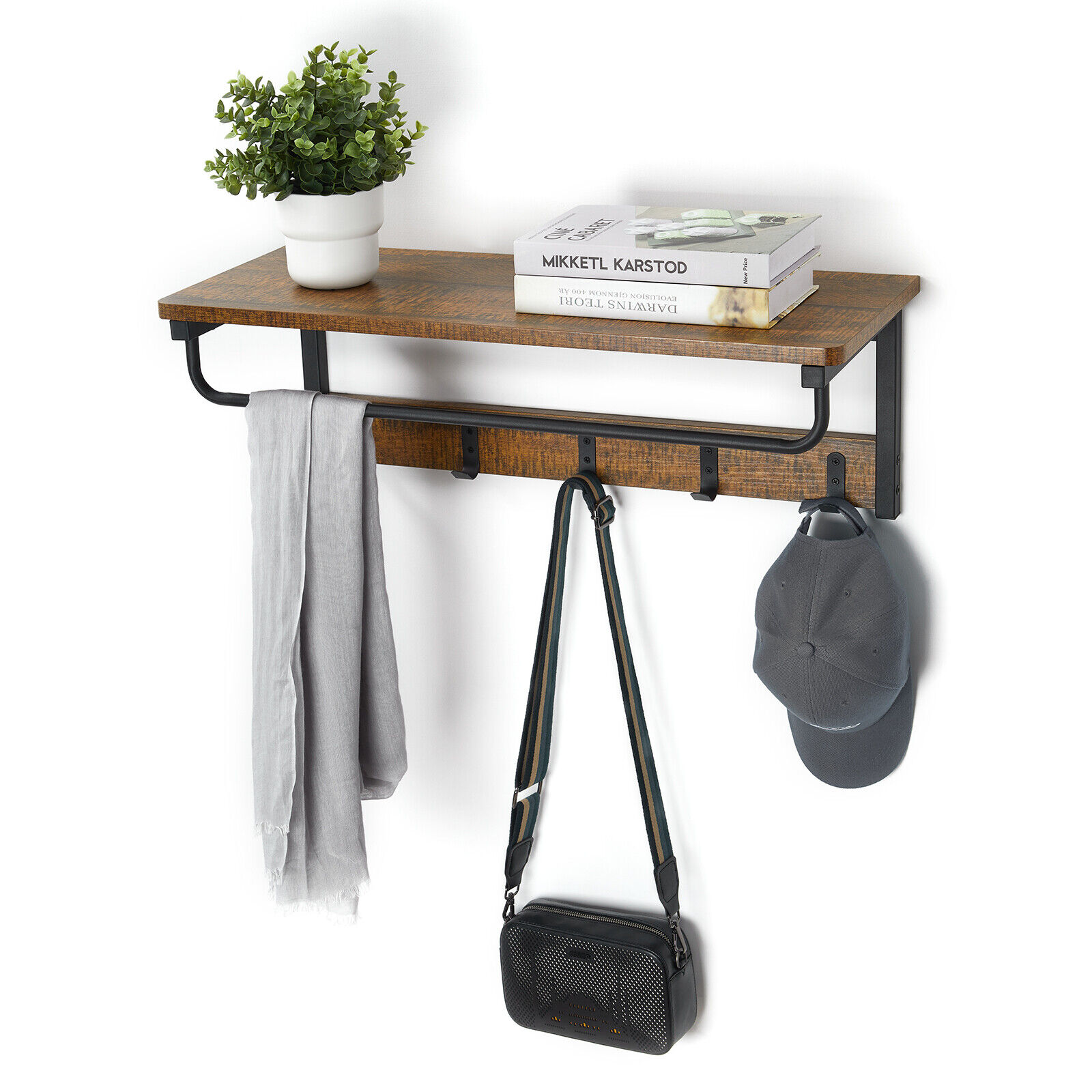 Wall Mounted Coat Racks 5 Hooks Rack Shelf Vintage Hanger with Hanging Rail