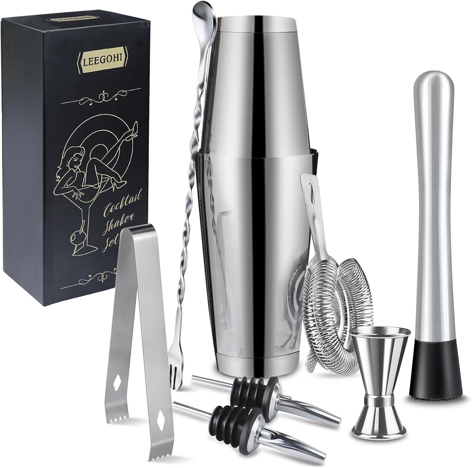 Gabrella Cocktail Shakers Set, 23PCS Cocktail Set, Cocktail Making Kit with 750ml Boston Shaker, Strainer, Jigger, Mixing Spoon, Tongs, Bottle Stoppers, Opener, Recipes for Drink Mixing, Home, Bar