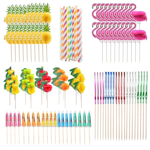 AYNKH 120 Pcs Cocktail Accessories Set,Cocktail Umbrellas, Straws, Stirrers (Flamingo/Pineapple/Sparklers) | Tiki Bar Accessories, Hawaiian Party Supplies, Reusable for Cocktails, Mocktails, Drinks |