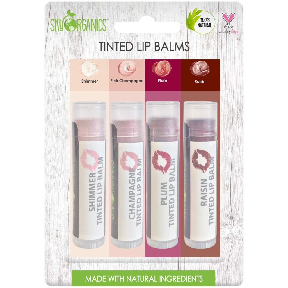 Sky Organics Organic Tinted Lip Balm 4 Pack Assorted Colors - with Beeswax, Coconut Oil, Cocoa Butter, Vitamin E- Minty Lip Plumper for Dry, Chapped
