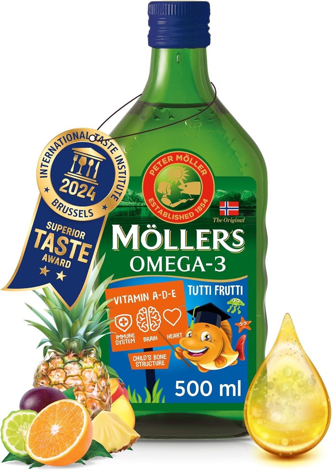 Moller’s ® | Omega 3 for kids Cod Liver Oil | Nordic Omega-3 Dietary Supplements with EPA, DHA, Vitamin A, D & E | Pure, Natural cod Liver Oil Liquid | 166-year-old-brand | Tutti Frutti Taste | 500 ml