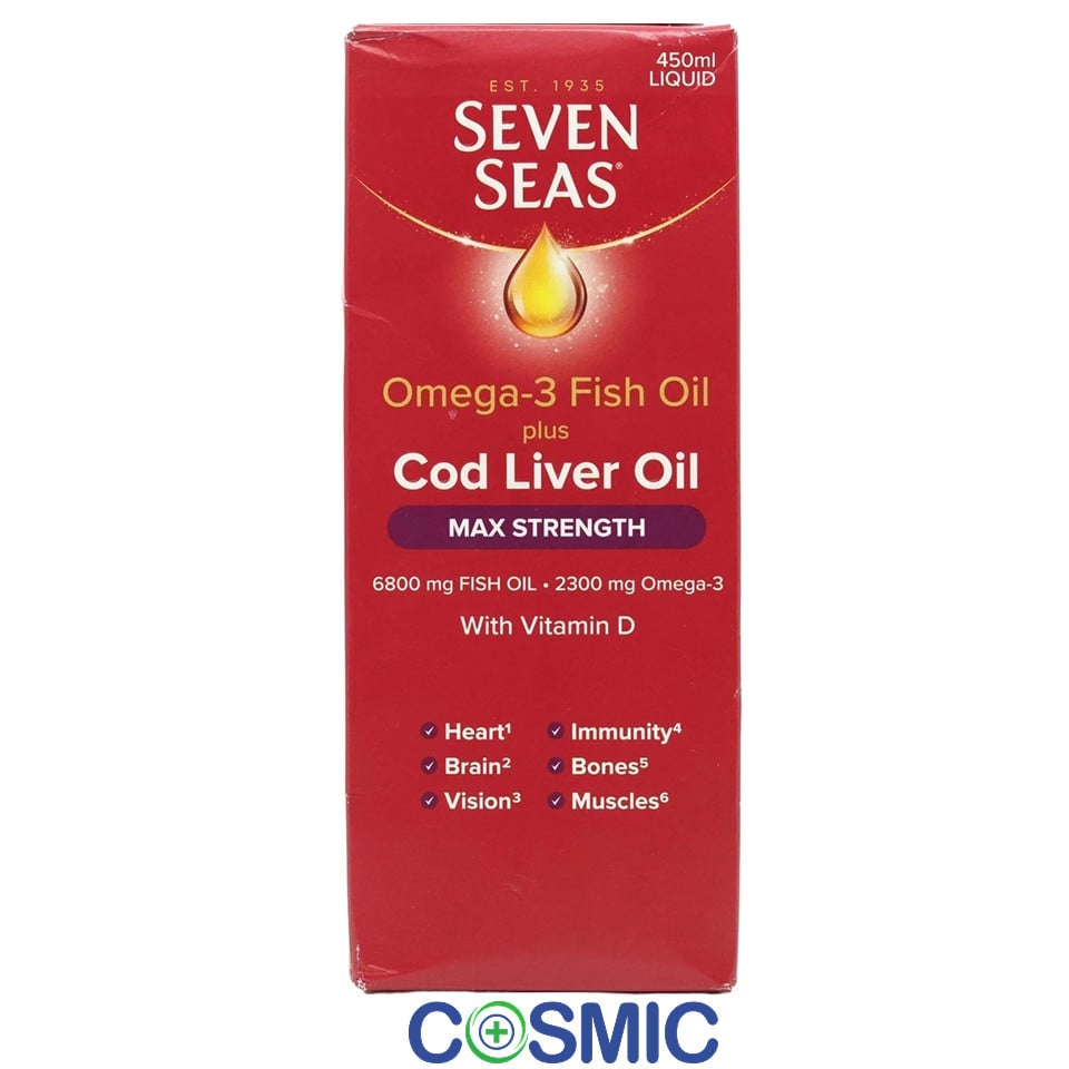 Seven Seas Omega-3 Fish Oil Plus Cod Liver Oil MAX STRENGTH 450ml liquid. With Vitamins D And E