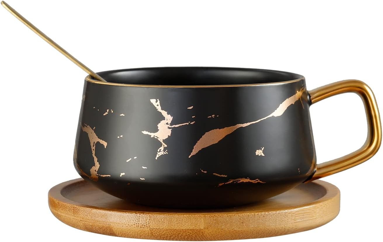 Marble Ceramic Coffee Mug Sets Tea Cup with Spoon Wood Saucers, Gifts for Valen