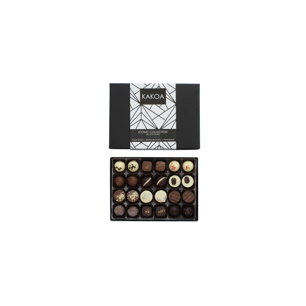 Kakoa Iconic Vegan Chocolate Selection Box - 24 Chocs | Brownie, Coffee, Caramel, Liqueur | Plant Based Luxury Chocolates For Special Occasions |