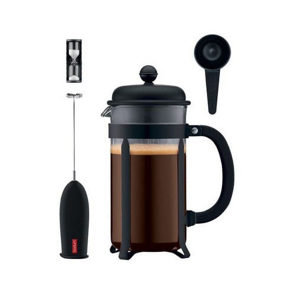 Coffee Press 4pc Set - Black: French Press Coffee Maker with Battery-Powered Frother & Scoop, 8 Cup Capacity