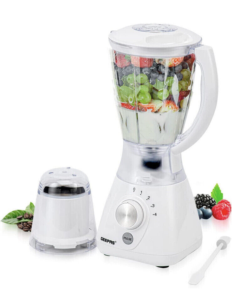 GEEPAS 2-in-1 Food Jug Blender & Smoothie Blender | Ice Crusher Stainless Steel Blades 4 Speeds Pulse Mode | 1.5L Jar Smoothie Milkshake Maker Coffee/Spice Grinder Mill | 1 Year Warranty 550W White