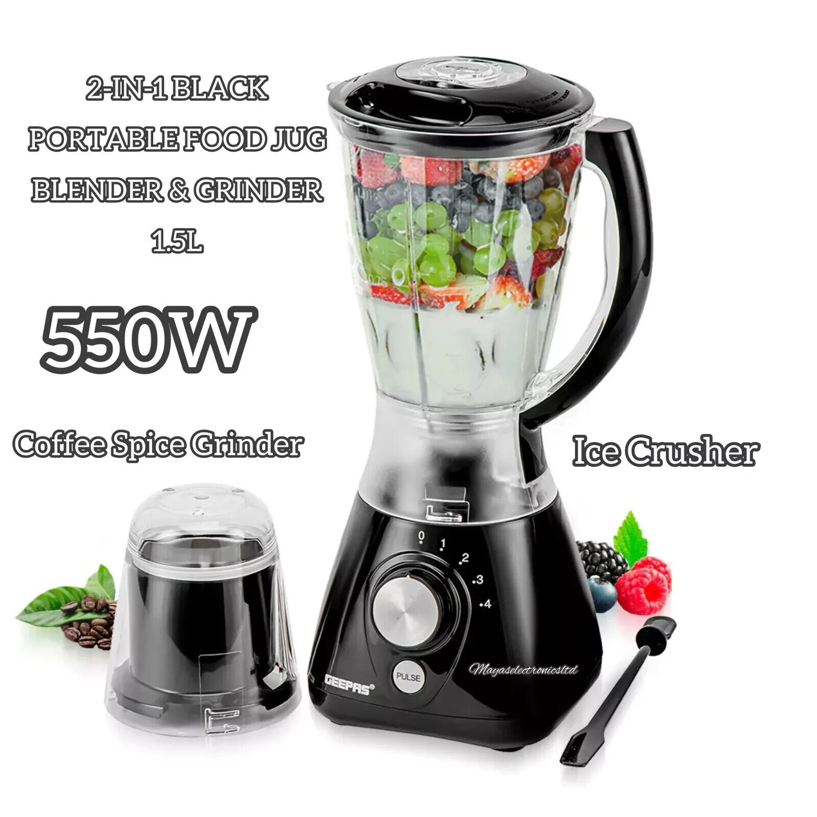 Geepas 550W 2 in 1 Food Jug Blender Ice Crusher, Mill,Coffee/Spice Grinder Black
