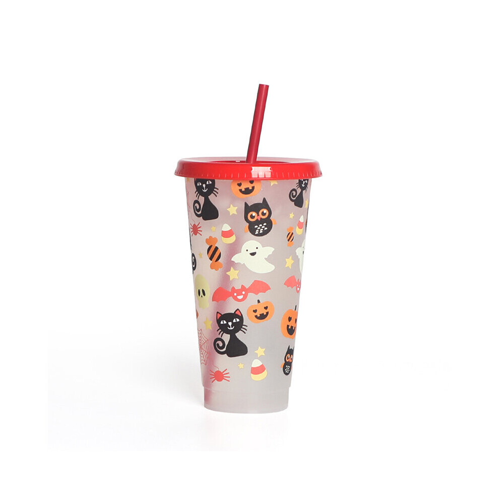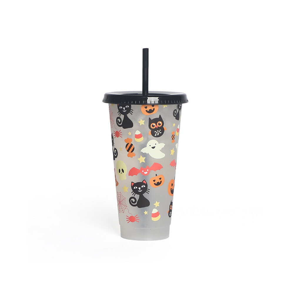(a-Black) 710ml Halloween Straw Cups With Lid Creative Discoloration When Cold Drink Water Bottle Reusable Plastic Portable Coffee Mug